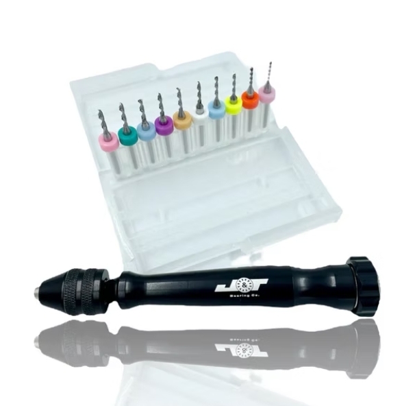 The J&T Steel Twist Drill Set, a precision hand drill set-up with ten bits, a black anodized aluminum hand drill and a convenient carrying case. The steel bit have been color coded to speed up repair time and keep organized. This set includes ten pieces, increasing in 0.1mm increments ranging from 1.1 to 2mm. Now available in half sizes ranging from 1.05-1.95