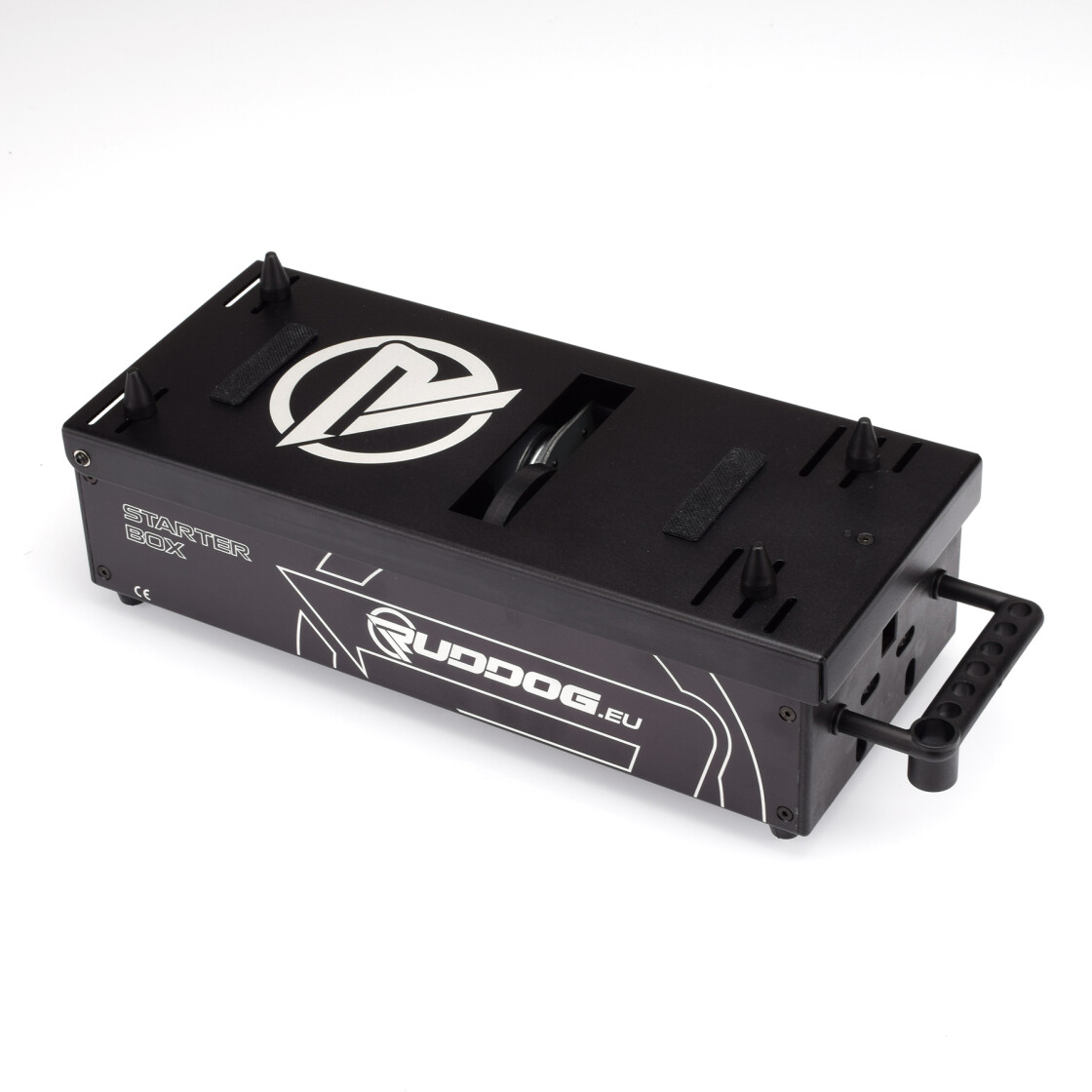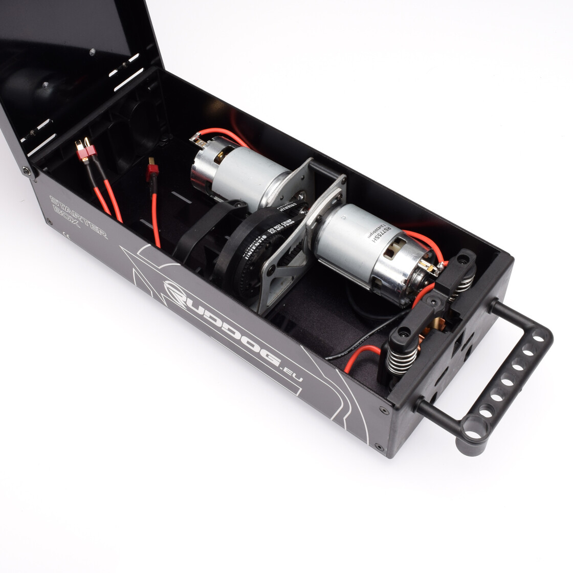 The RUDDOG 1/8 Nitro Offroad Starter Box is of a universal design for all 1/8 offroad needs. Housed in a sturdy, black-coated aluminium case the heavy-duty starter box is powered by two 775-size motors with the durable belt-driven starter wheel allowing for an easy and convenient start of both run-in and also brand-new nitro engines. The starter box was developed for the use with two 2S LiPo battery packs and it comes pre-wired with T-type connectors. Highly adjustable stopper cones allows to adapt the starter box to pretty much every 1/8 scale off-road chassis. Laser-etched RUDDOG logos and a handle with glow igniter holder round out the package.