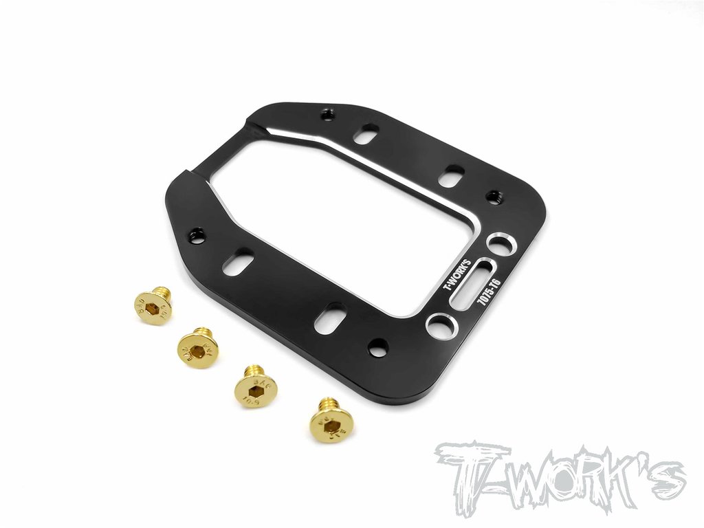 It is made for the Kyosho MP9 TKI4 and TKI3 buggies is a 1-piece engine mount plate. The part is designed to replace the standard 2-piece mount for a sturdier and cooler looking item. The plate improves precision while adding a bit of reinforcement to the engine area which can be useful on smooth high-bite tracks. The black anodised 7075-T6 alloy plate sports machined silver edge details and it comes with a set of gold-colour steel screws.
